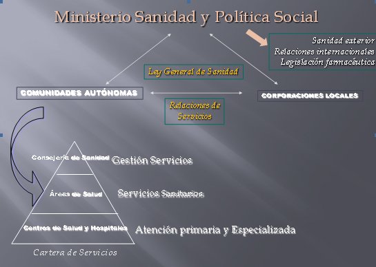 El Sistema Nacional Salud se estructura en tres niveles: Ministerio de Sanidad y Política Social, Comunidades Autónomas, y Corporaciones Locales. Cada una de ellas con funciones y competencias diferentes.